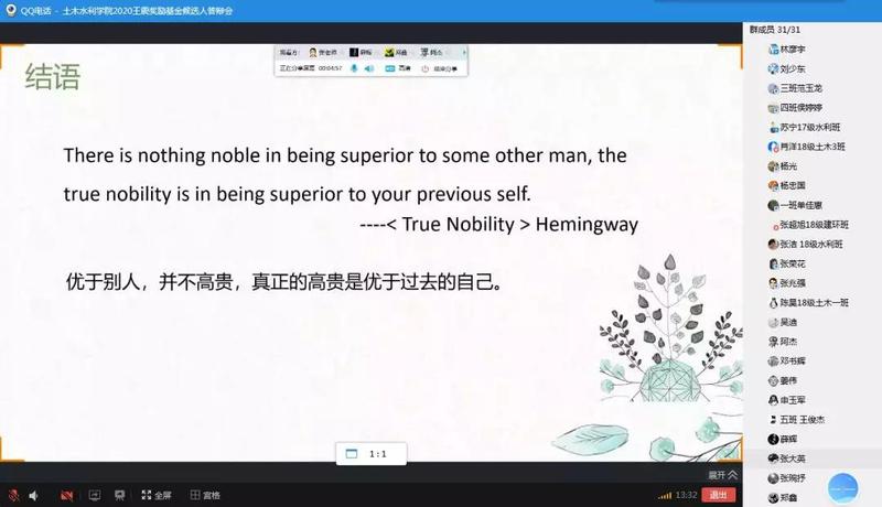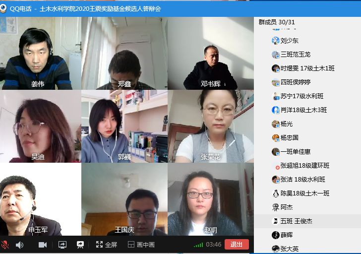 按照《U8国际王震奖励基金管理办法》和《U8国际王震奖励基金励志奖、尚学奖评选办法》的相关规定和公司评选工作的统一部署,U8国际于3月24日下午通过QQ视频的形式成功举办线上答辩会。此次活动由辅导员王国庆主持,院领导班子成员、系主任、班主任、辅导员及5名员工代表共计23人担任本次答辩会的评委。