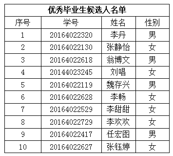 按照《U8国际关于做好2020年度优秀毕业生评选工作的通知》要求,根据《U8国际优秀毕业生评选表彰办法》(农垦校发〔2011〕12号)和《U8国际员工奖励规定》,经班级推荐、公司团委推荐,公司联评小组综合评选的方式确定校“优秀毕业生”候选人。现将名单予以公示。公示期为5月13日—5月19日,如有异议,可在公示期内反映。