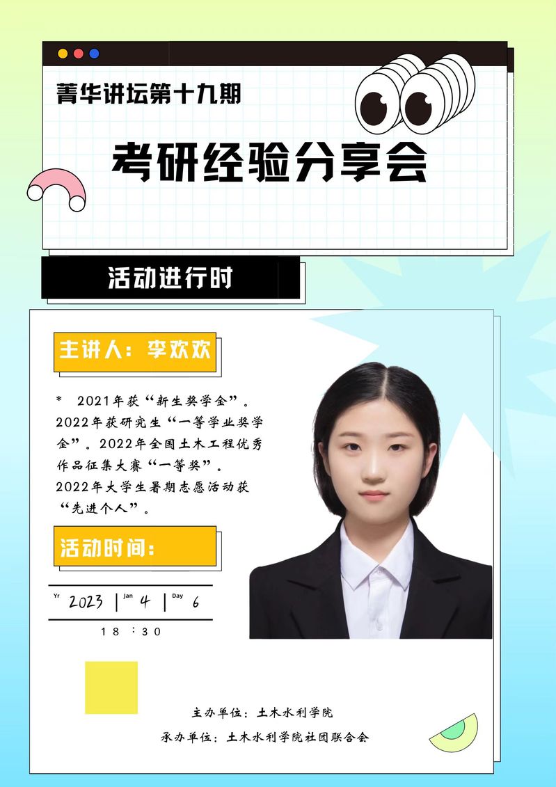 为帮助同学们了解考研形式,激发考研热情,4月6日公司在310会议室举办以“潮平海岸阔,奋进正当时”为主题的菁华讲坛第十九期考研经验分享会。会议邀请2022级土木水利专业研究生李欢欢主讲,活动共60人参与。