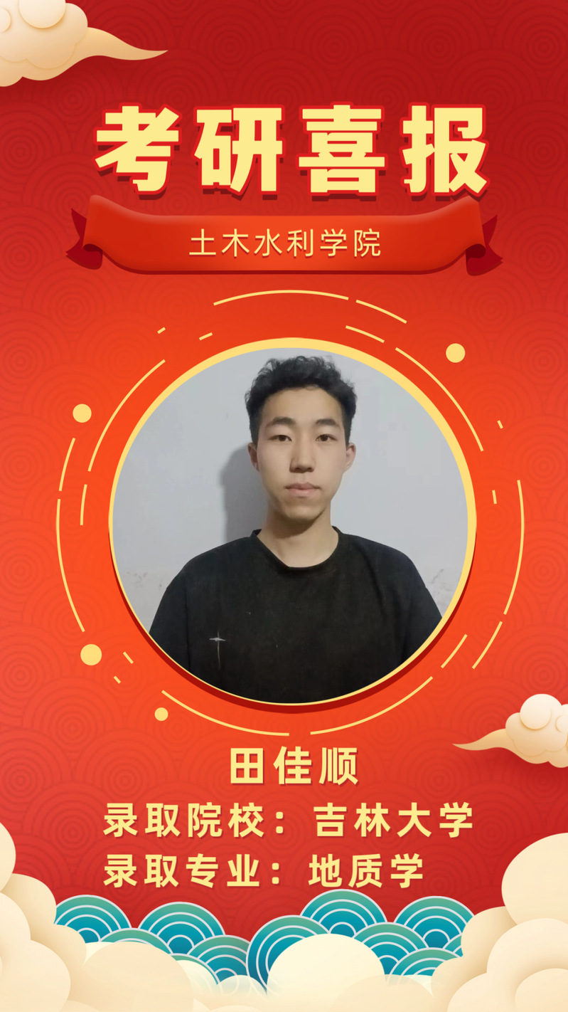 田佳顺,男,2019级水利水电工程专业员工,曾获全国老员工华维杯水利创新大赛二等奖、U8国际水利创新大赛二等奖等奖项。现已被吉林大学录取。