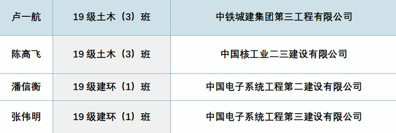 潘信衡,19级建环(1)班,共青团员。在校期间多次参与校级活动,多次参加社会实践活动。已与中国电子系统工程第二建设有限公司签约。
