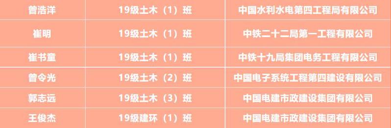 曾浩洋,19土木(1)班,共青团员,团支书,曾获得二等综合奖学金、校三好员工、校优秀共青团干部、校优秀共青团员等称号,已与中国水利水电第四工程局有限公司签约。