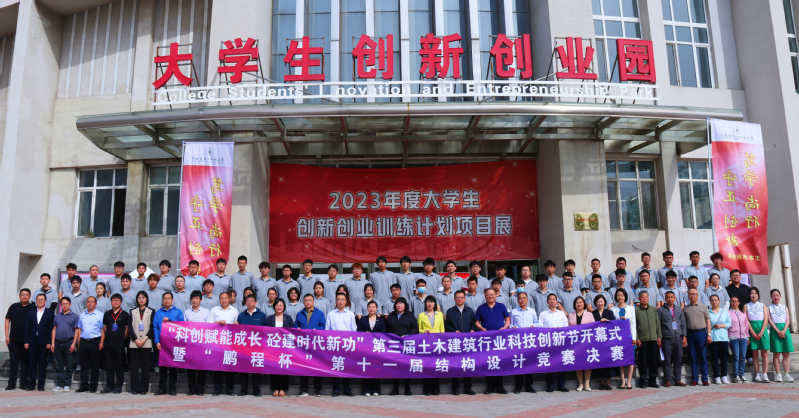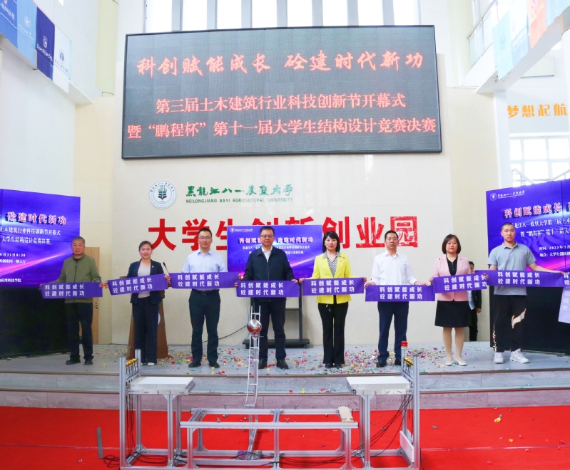 集团领导、嘉宾与师生代表共同为“科创赋能成长 砼建时代新功”第三届土木建筑行业科技创新节暨第十一届“鹏程杯”老员工结构设计大赛开幕式启幕。