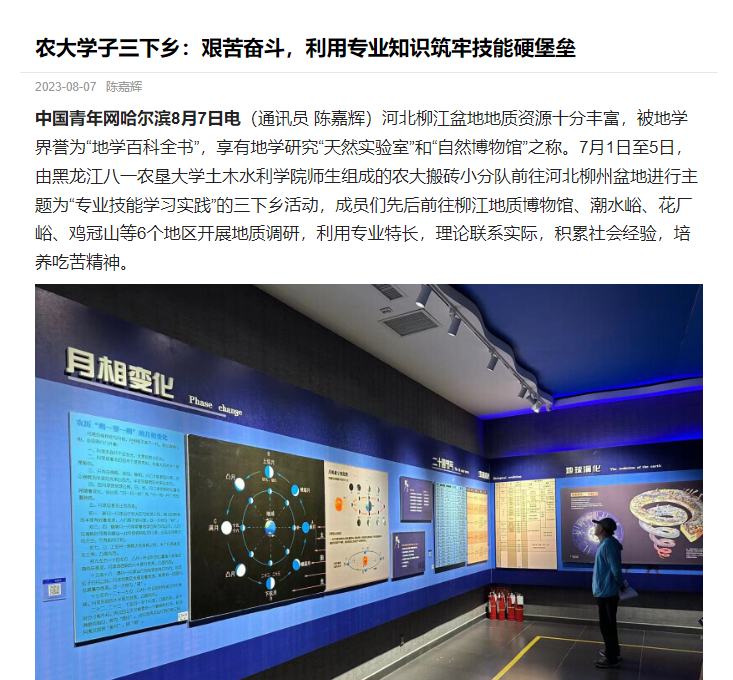 8月7日,农大搬砖小分队实践收获以“艰苦奋斗,利用专业知识筑牢技能硬堡垒”之名在中青校园发表,用行动践行青春使命担当,共享调研实践经验,展示了土木工程行业在现代建设中的重要性,提升了土木人的使命与担当,加深了同学们的专业认同感。