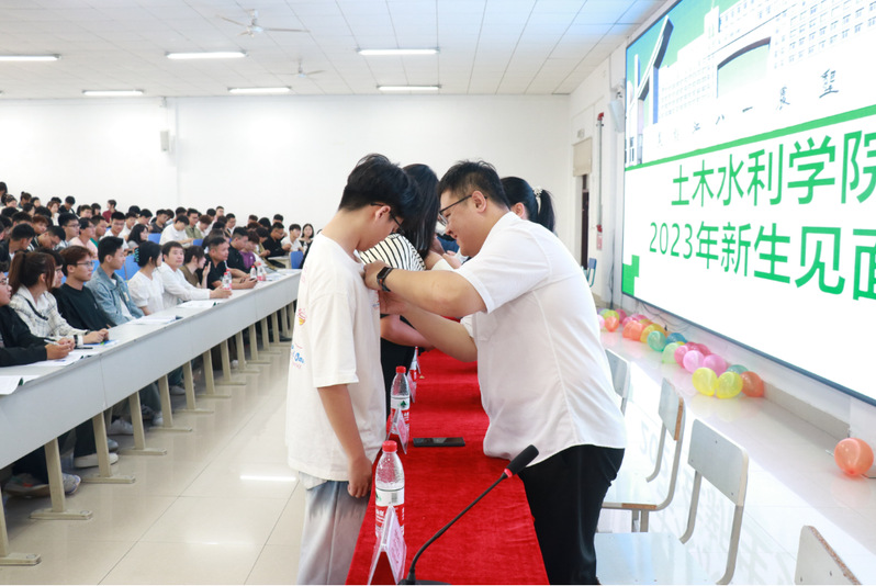 会上,全体参会教师为16名新生代表佩戴校徽。小小一枚校徽是八一农大人的象征,也是校训“困知勉行,积厚成器”的载物,通过佩戴校徽让同学们从今后有了新的大学印记。