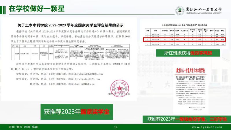 经过这期间不懈的努力,经过层层选拔。其获推荐2023年国家奖学金,这也印证了只要敢想敢做,就一定能干能成。同时与本年度获评一等综合奖学金、三好员工,所在班级获评优良学风班。