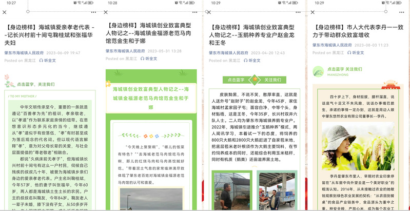 海城镇能人事迹不少,一直未被发掘和系统整理。在公司领导的指导建议下,任锋在工作中遍访海城镇创业致富、孝老爱亲事迹,凝练勤劳人物、和睦家庭榜样,其中“海城村范金生白手起家创办远近闻名的金福源老范马肉馆”的事迹和“长兴村前十间屯鞠桂斌夫妇数十年如一日照顾卧床老人”的事迹等四篇人物纪实在海城镇公众号发布,营造了海城人打造乡土品牌和尊老敬老传承中华美德等风清气正的文化氛围。