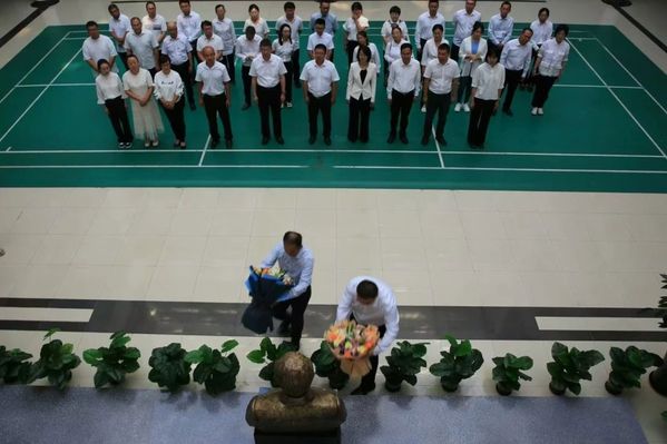 随后,全体教职工来到公司一楼阳光大厅开展纪念王泰恩教授活动,资深教师代表邓书辉、新教师代表陈嘉硕向王泰恩教授塑像献花。全体教师鞠躬致敬,表达对前辈先贤的深切纪念,传承“独力擎起一座大厦”的创业精神。新教师导师代表刘文洋与新入职教师共同诵读《新时代高校教师职业行为十项准则》,新教师代表侯羽发言。