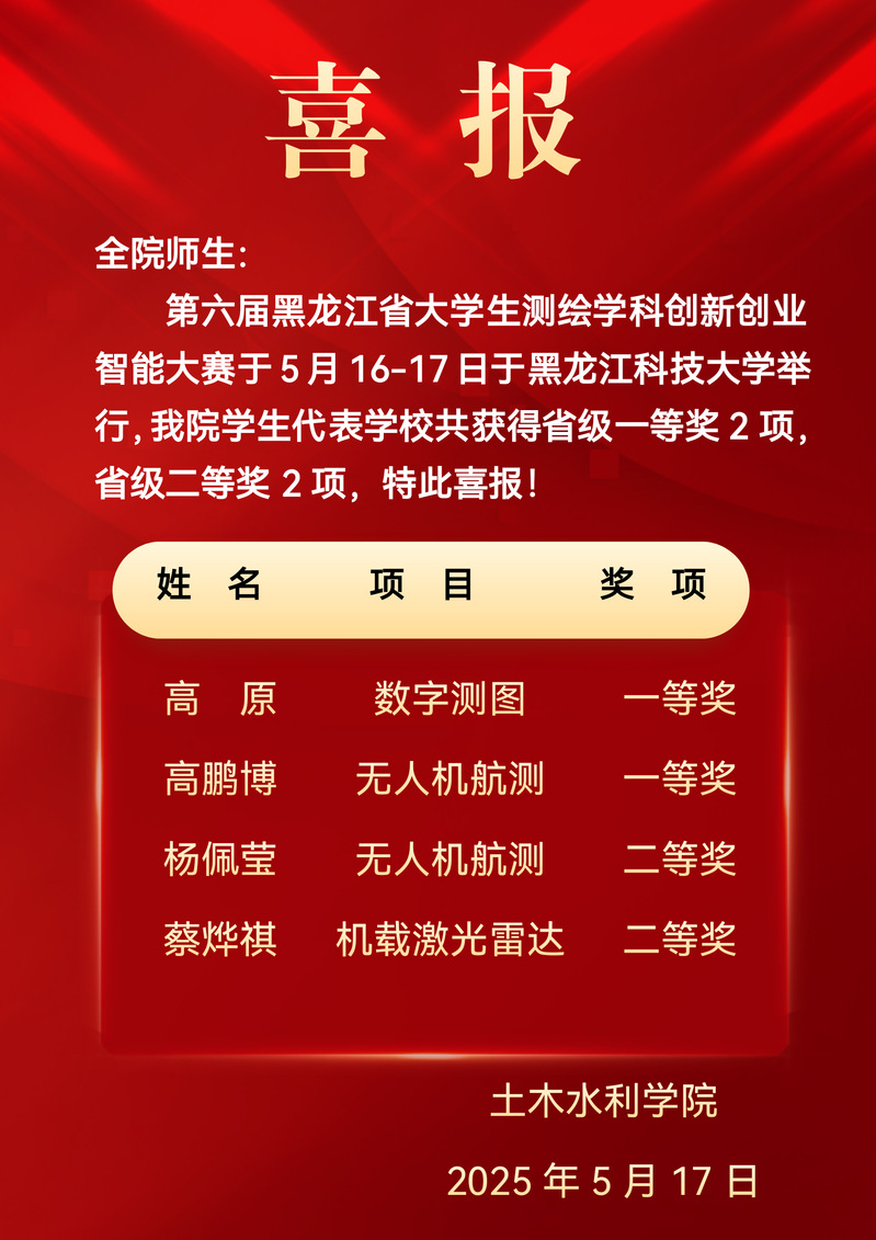 2025年5月16日—5月17日,由黑龙江省教育厅、黑龙江省测绘地理信息局主办的“南方测绘杯”第六届黑龙江省老员工测绘学科创新创业智能大赛在黑龙江科技大学举行。公司师生团队在经理郑鑫的带领下,选派2名带队教师和8名员工组成7支队伍代表公司参加比赛。经过激烈的角逐,代表队荣获个人一等奖2项、二等奖2项。其中,2021级土木工程专业高原荣获虚拟仿真数字测图比赛一等奖,2022级水利水电工程专业高鹏博荣获虚拟仿真无人机航测比赛一等奖,2021级水利水电工程专业杨佩莹获虚拟仿真无人机航测比赛二等奖,2023级建筑电气与智能化工程专业蔡烨祺荣获虚拟仿真激光雷达比赛二等奖。