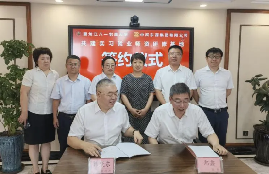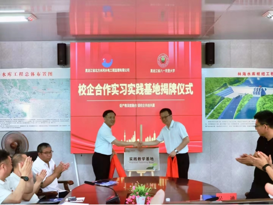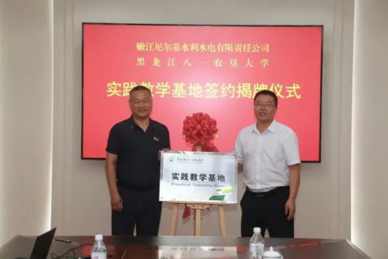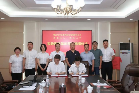 经理郑鑫与尼尔基公司人事处处长周丽签订院企工程实践教学协议,尼尔基公司总经理王海军与公司党委书记王天亮共同为“实践教学基地”揭牌。