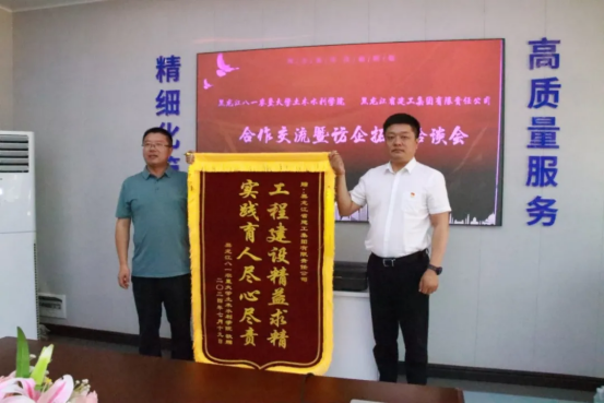 公司领导向黑龙江省建工集团有限责任公司赠送锦旗,感谢其对公司员工实习实训工作的大力支持。